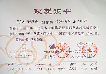 荣获"天工艺苑•百花杯" 中国工艺美术精品奖优秀奖