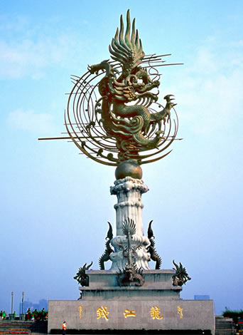 2007年6月19日,高达48米的青铜巨雕《钱江龙》在杭州钱塘江畔落成揭幕。各大媒体纷纷报道称,这是目前国内最高的巨龙雕塑,是杭城滨江区标志性城市景观。而这座巨雕也仅仅是射潮广场巨型群雕《钱王射潮》的一个组成部分,却也让人感受到杭州的气度和胸怀,精神和风采。