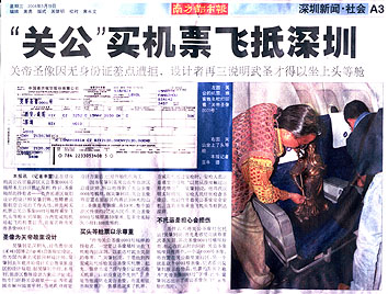 本报讯(记者丰雪) 由山西宇达集团公司设计制作并推出的关公圣像第0001号本月15日抵达深圳。昨日,来自深圳的吴肇钊先生称,他特意说服航空公司的工作人员,开先河买机票让关公圣像0001号乘坐飞机头等舱来到深圳。由西安咸阳机场起飞的机票显示,旅客名称为关帝圣像0001号。
