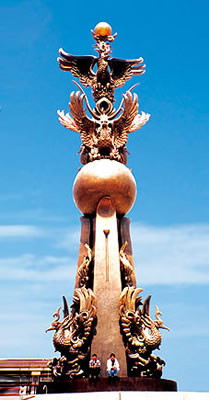 2000年春节前,芜湖市委、市政府为了加快跨世纪大开放的力度,同时为提供给市民一个文化、休闲的优美生活空间,决定在原市政府旧址、市中心美丽的镜湖边建设一座大型城市中心广场,终审通过的广场设计方案中有一尊象征芜湖城市形象、反映历史文化的主题雕塑,设计高度为28米,芜湖的决策者们一致把设计雕塑的最佳人选定格在当今著名艺术家韩美林先生身上。这位被国际友人誉为"中国毕加索"的艺术家,人们都熟悉他的惟妙惟肖的动物画,更多是从每年国家邮政部门发行的贺年卡上,从电视、报纸、杂志的媒体上,从每次轰动全国的个人艺术展上看到他在绘画、陶艺、布艺、书法、设计等艺术领域的佳作,知道他丰硕的艺术成就。他设计的中国国际航空公司飞机机翼上的凤凰标志几乎飞遍了全世界浩翰的天空,他参与创作的北京申奥标志挂满了首都紫禁城,他为亚特兰大奥运会设计的高9米的"五龙钟塔"纪念雕塑永久矗立在美国的土地上,他设计的深圳龙岗广场高达25米的"祥瑞福辏"青铜雕塑被誉为"伟大的艺术工程",他设计创作的大连老虎滩的"群虎"巨型石雕长达42米,重达4800吨,他的雕塑、画作三十余次被党和国家领导人作为出国访问的国礼馈赠给外国政要......