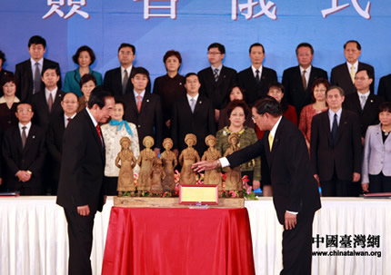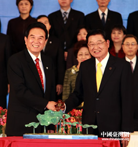 2010年12月21日下午,海协会会长陈云林与海基会董事长江丙坤正式签署《海峡两岸医药卫生合作协议》,双方并在协议签署后互赠礼品。图为海基会致赠海协会方面的陶土作品《齐心传唱 和谐天籁》。 两岸两会领导人第六次会谈21日在台北举行,海协会会长陈云林和海基会董事长江丙坤于当天下午正式签署《海峡两岸医药卫生合作协议》。协议签署后,双方互赠纪念品。 海基会致赠海协会方面的礼品是名为《齐心传唱 和谐天籁》的一组陶土雕塑作品。海协会回赠海基会方面的是一尊莲花造型雕塑《好事连连》,寄托对两岸关系和平发展的款款美意。(特派记者 李徽) (来源:中国台湾网) | |