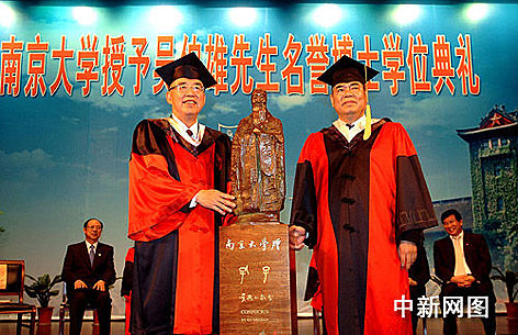 2009年5月31日上午,在南京大学礼堂内隆重举行授予国民党党主席吴伯雄先生法学名誉博士学位典礼。南京大学向吴伯雄先生赠送了珍贵的礼物——《孔子像》,雕像由南京大学美术研究院院长、中国雕塑院院长、英国皇家雕塑家协会成员吴为山教授创作。亦是旨在弘扬我们共同的文化,促进两岸增进共识,增强民族凝聚力。