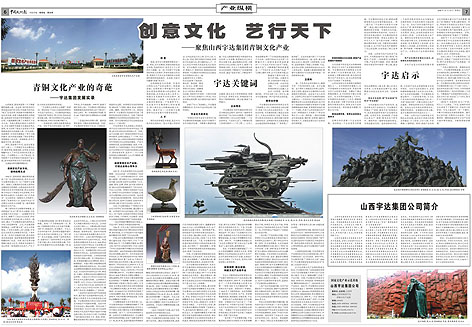中国文化报2008年11月14日在六、七两版的《产业纵横》大篇幅以《创意文化·艺行天下》为题强势报道宇达青铜文化产业引起巨大反响,文中分为"宇达关键词"、"宇达启示"、"宇达发展实录"三大版块深入剖析了宇达的发展、战略、思路等;该文由山西省委宣传部研究室谢振中撰写。