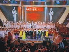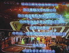 中国电影金鸡、百花奖颁奖晚会于2006年10月28日在杭州举行,中央电视台三频道现场直播,山西宇达集团与中国电影界的深厚渊源,其公司名称出现在鸣谢字幕上。图为电视照片。